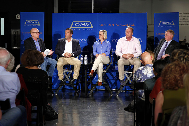 The cliché about Californians is that when asked where their water comes from, they say “the tap” or “plastic bottles,” said Sierra Magazine editor-in-chief and Occidental College adjunct professor Bob Sipchen. “But if you really think about it, all Californians in particular have a really direct and emotional connection to water.” Sipchen, who was moderating an event co-presented by Occidental College at the Petersen Automotive Museum on the future of water reuse in California, began by asking the panel to share their most tangible memories of water. The panelists—who are involved in water recycling throughout the state in one way or another—mentioned sandbagging on the Mississippi River, the water meter on a grandfather’s farm, a swimming pool fed by a well that then irrigated the lawn, and golf course ponds in Arizona.