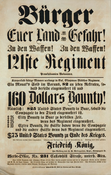 Another recruitment broadside called on New York’s German immigrants to fight for “your country”: Bürger, Euer Land ist in Gefahr! Zu den Waffen! Zu den Waffen! (Citizens, your country is in danger! To arms! To arms!)