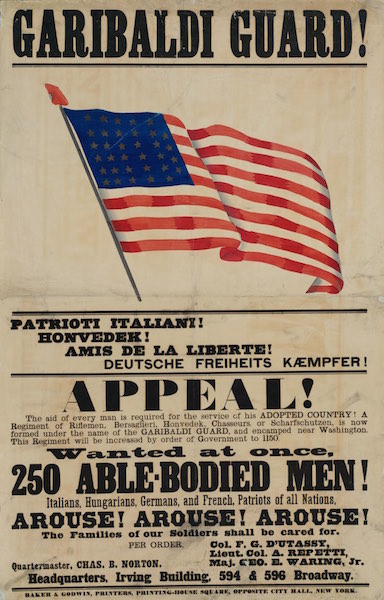 One poster reads: Patrioti Italiani! Honvedek! Amis de la liberté! Deutsche Freiheits Kaempfer! (Italian patriots! Hungarians! Friends of liberty! German freedom fighters!) Then, in English, it urges “250 able-bodied men … Patriots of all nations” to “Arouse! Arouse! Arouse!” and fight for their “adopted country.”