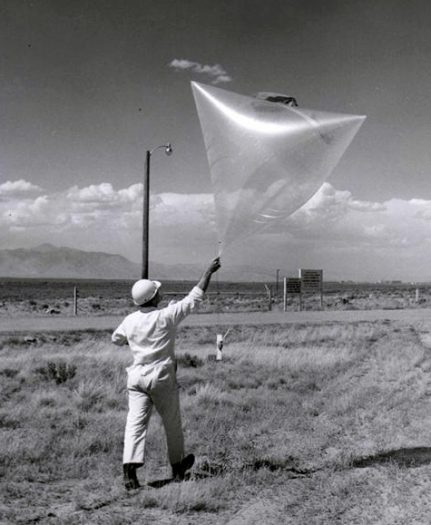 A tetroon being deployed by an ARL technician, 1950s. Photo courtesy of NOAA.