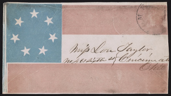 Envelope featuring the Confederate flag, addressed to Miss Lou Taylor of Cincinnati, Ohio. Image courtesy of Library of Congress.