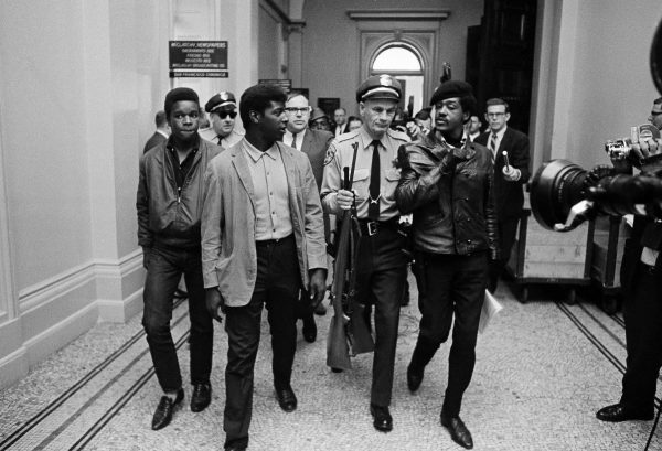 About two dozen African-American men and women, some wearing leather jackets and black berets, started toward the Capitol carrying rifles, shotguns, and pistols. They were not holding the weapons in a threatening manner; they were pointing them in the air as they marched up the steps and into the building. The news horde—with cameras rolling—stumbled backwards ahead of them, up the carpeted inner stairs to the next floor and into the chamber of the state Assembly, where a legislative session was underway.