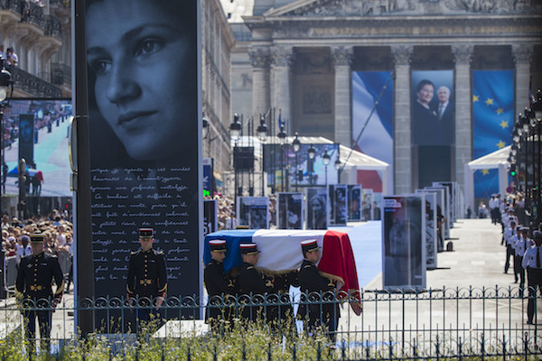 The flag-draped coffin of Auschwitz survivor and former French health minister Simone Veil is carried to the Panthéon mausoleum in Paris on July 1, 2018. Photo by Kamil Zihnioglu/Associated Press.