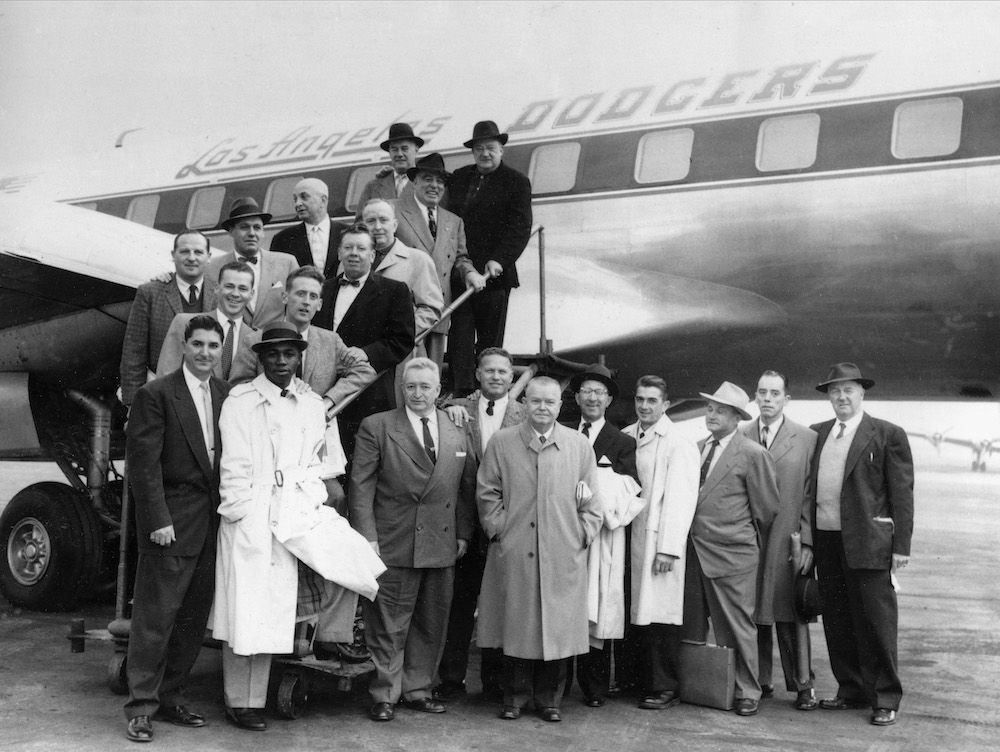 On October 23, 1957, officials and employees of the Brooklyn Dodgers posed in front of the club’s plane in New York City before leaving for Los Angeles. Courtesy of The Associated Press.