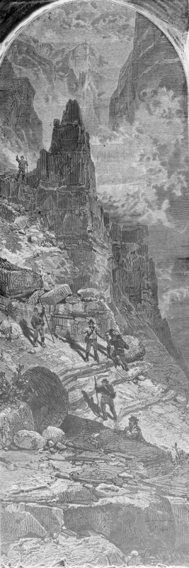 “Climbing the Grand Canyon” print from woodblock prepared by F.S. King; original artist Thomas Moran; print published in 1875 in Report of the Exploration of the Colorado River of the West and Its Tributaries. Explored in 1869, 1870, 1871, and 1872, under the direction of the Secretary of the Smithsonian Institution by John Wesley Powell. Courtesy of the Smithsonian Institution.