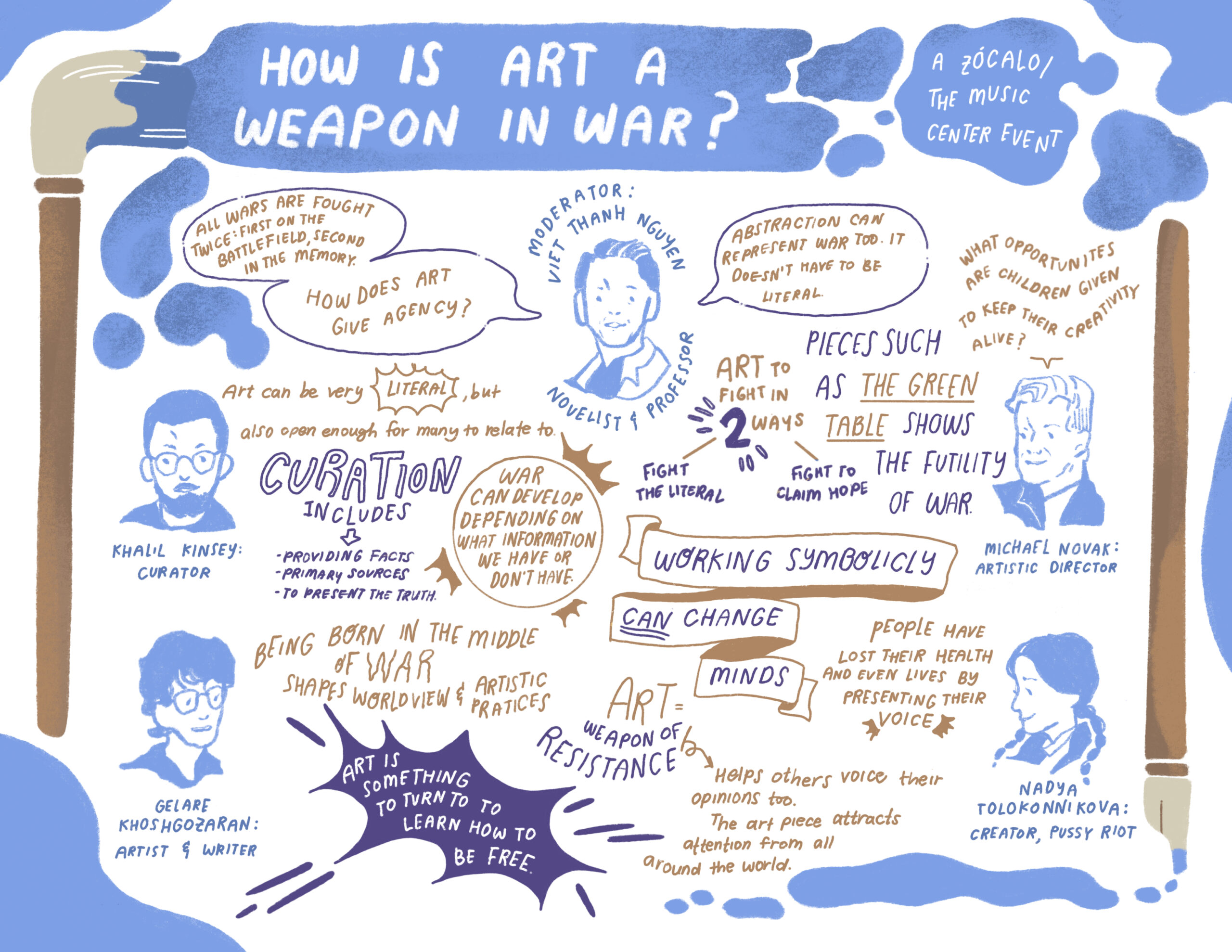 These were some of the many questions that guided last night’s Zócalo/The Music Center conversation, “How Is Art A Weapon in War?,” presented at Jerry Moss Plaza in downtown Los Angeles.