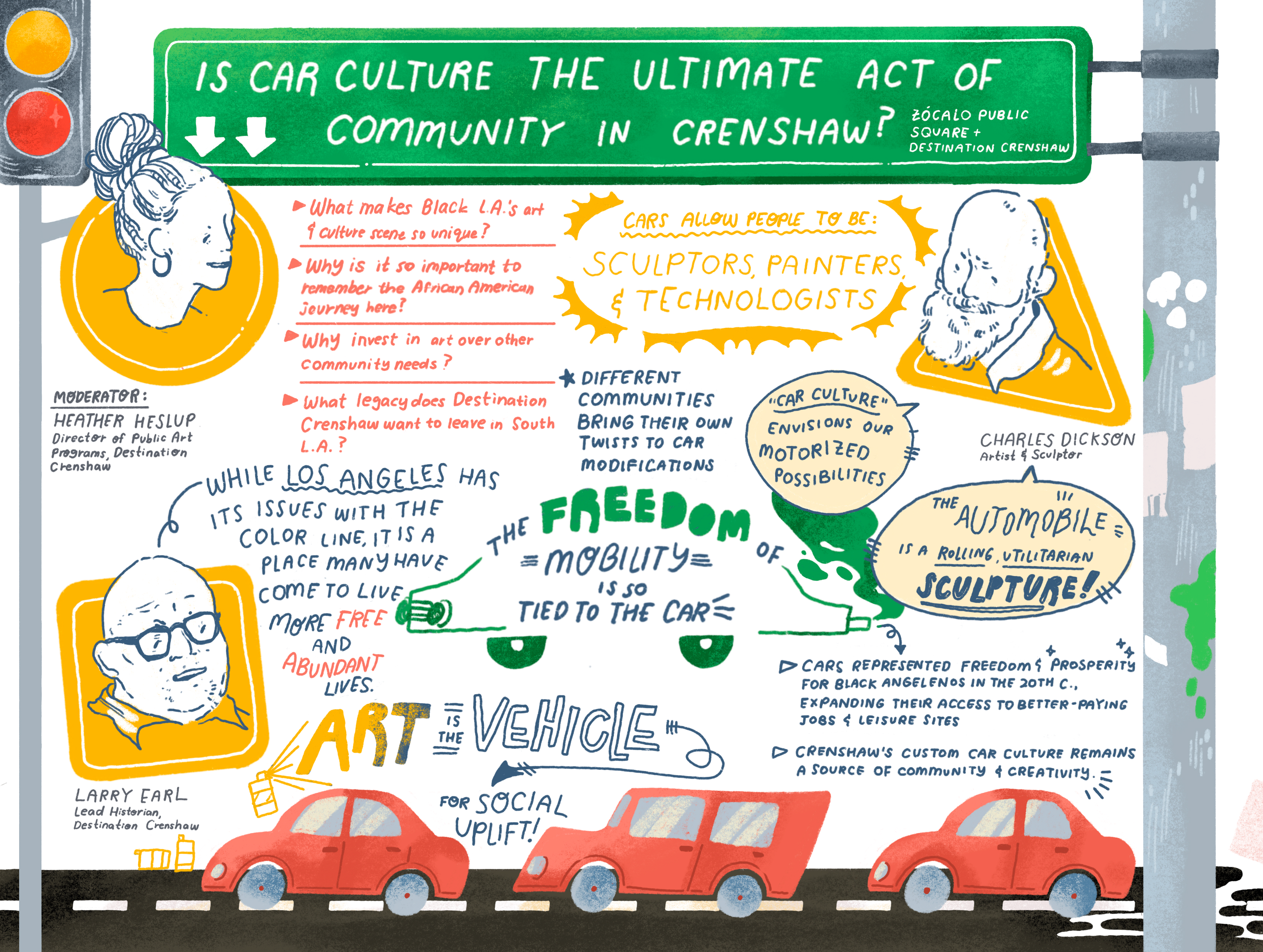 The project’s director of public art programs Heather Heslup and lead historian Larry Earl joined Dickson for the conversation, which touched upon the storied history of Black Angelenos and their automobiles, and why the car continues to represent a beacon of freedom and mobility for the Crenshaw community today.